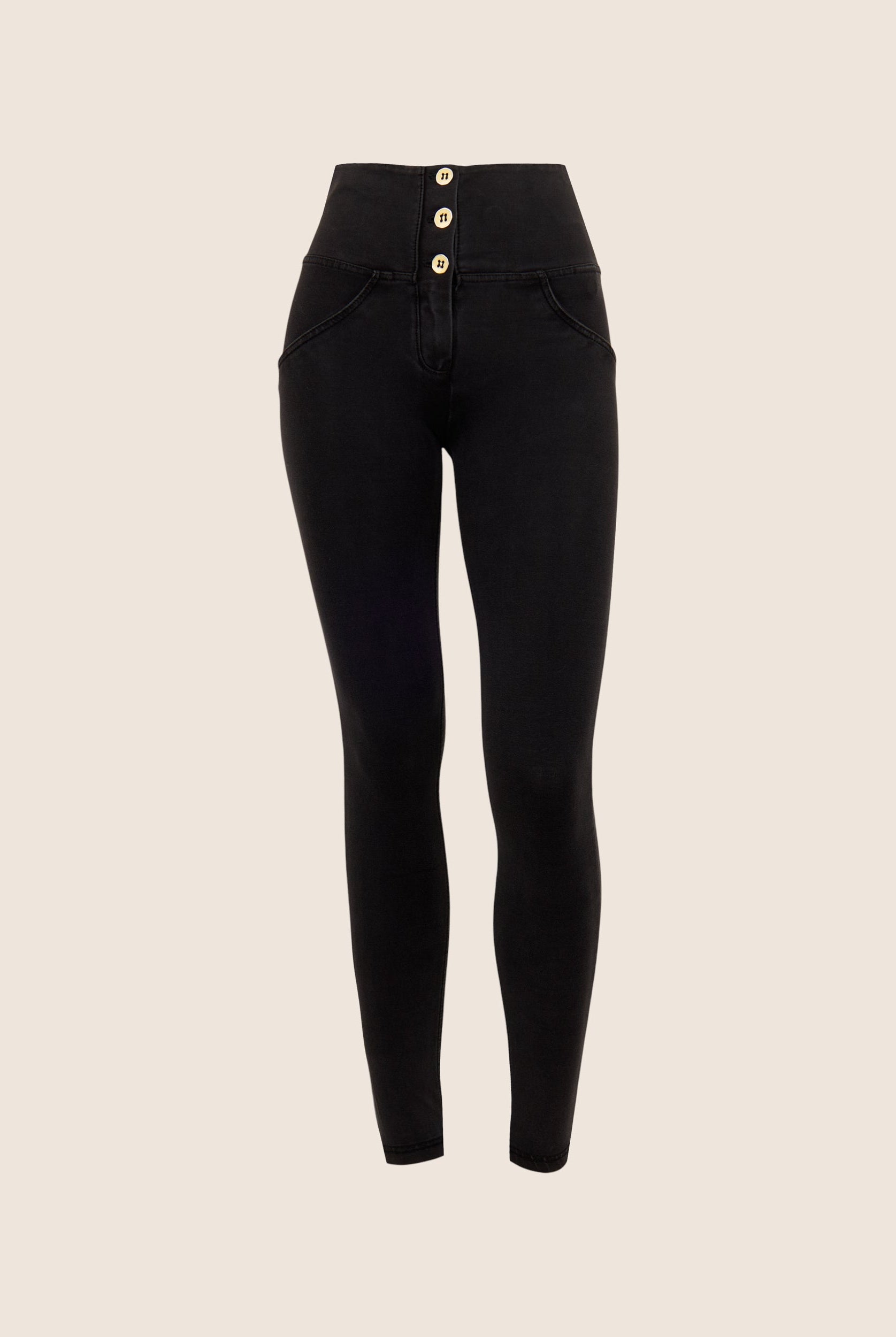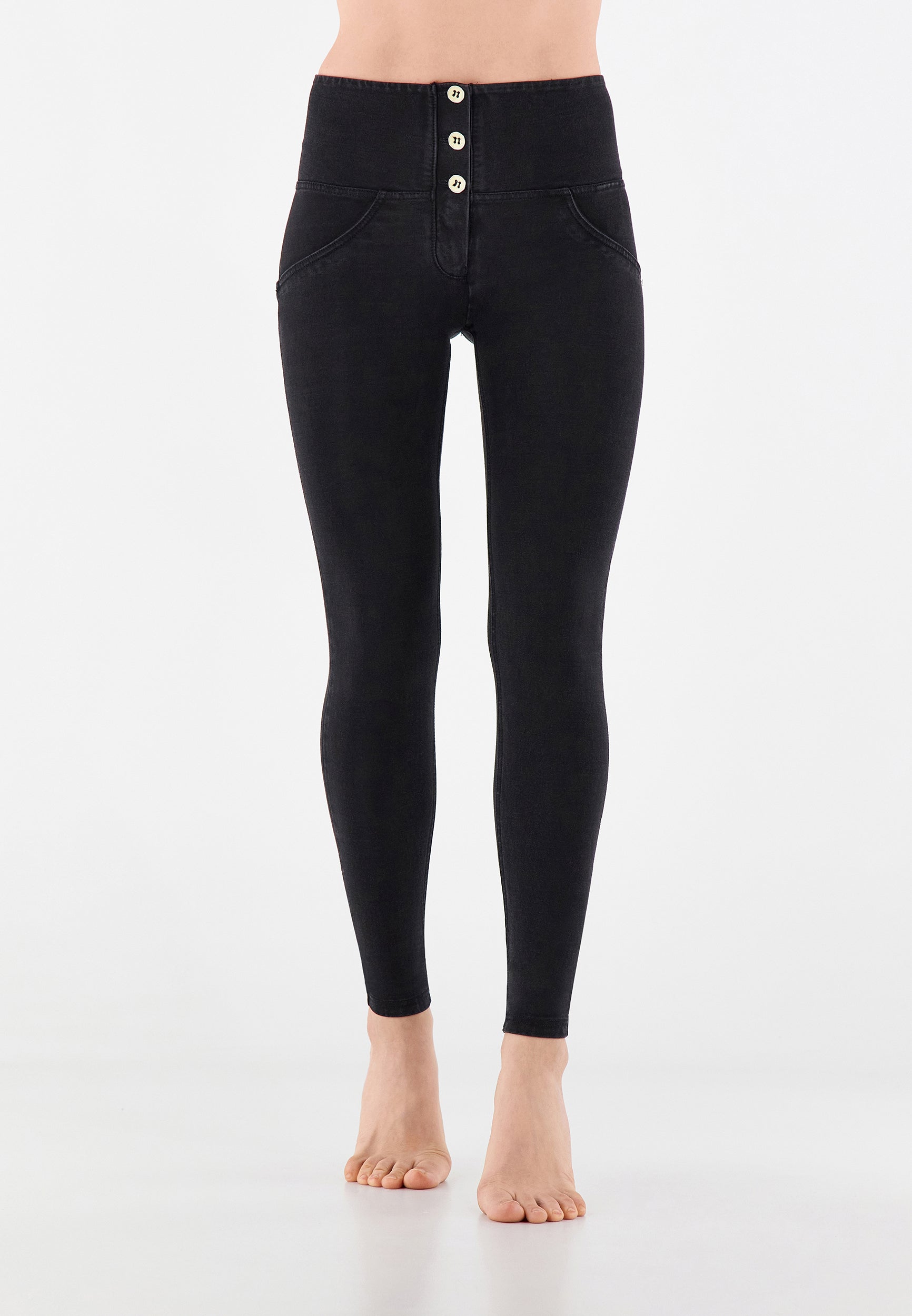Die Mid-Waist-Modelle sitzen zwischen der Taille und dem Bauchnabel. Alle unsere mittlere Jeans haben vorne drei Freddy-typische Knöpfe. Sie sind etwas höher als unsere Regular-Waist-Hosen, aber nicht ganz so hoch, wie die High-Waist-Modelle. Sie haben einen bequemen, hohen Bund ohne Silikonstreifen, und die Knöpfe sorgen für einen perfekten Sitz. Jeans in Mid Waist eignen sich vor allem für kurvigere Frauen, die mehr Stütze und Form für den Bauch und die Taille möchten. Zusätzlich zaubern die Hosen natürlich den perfekten Po.