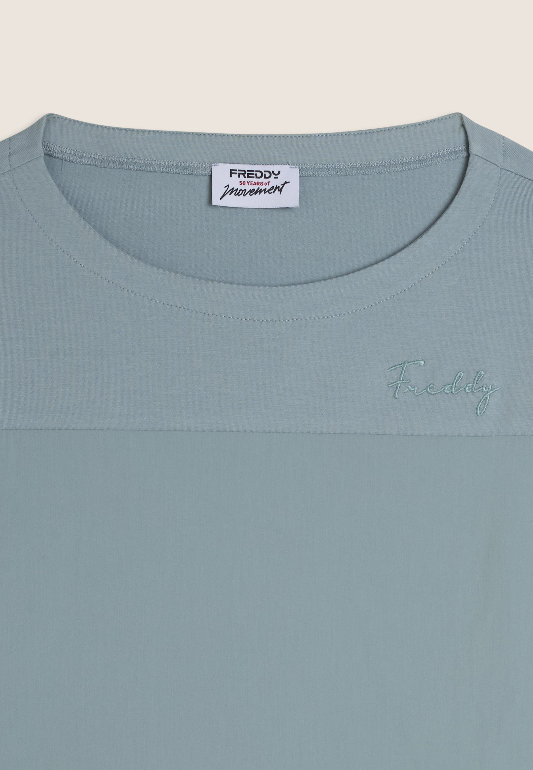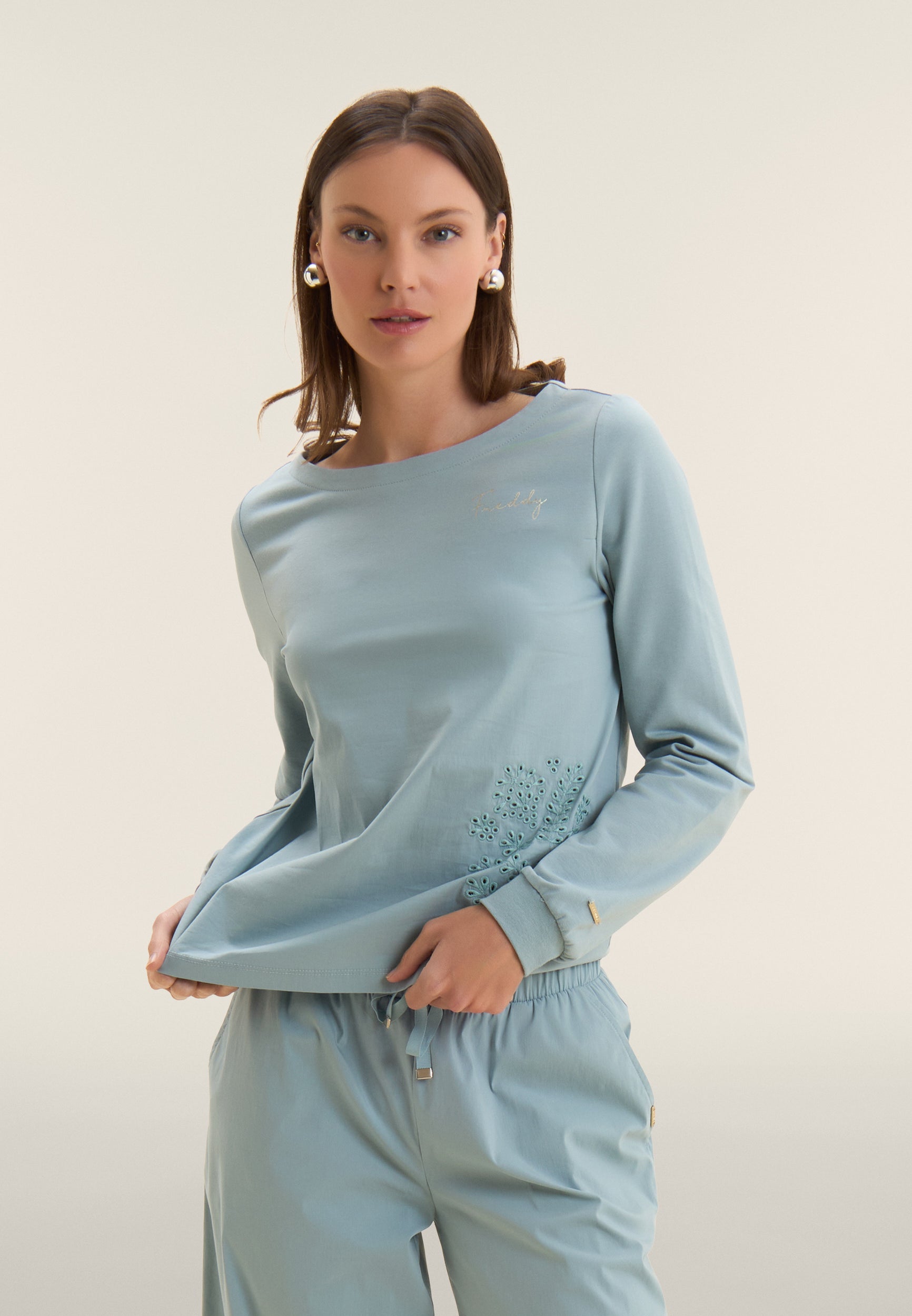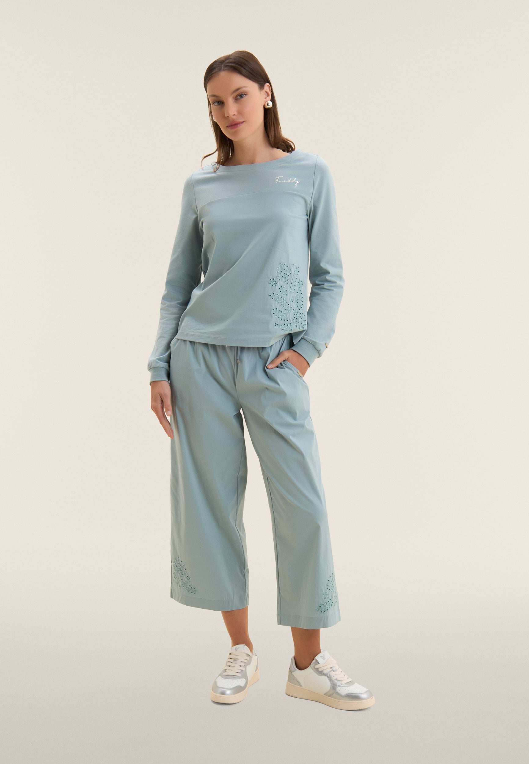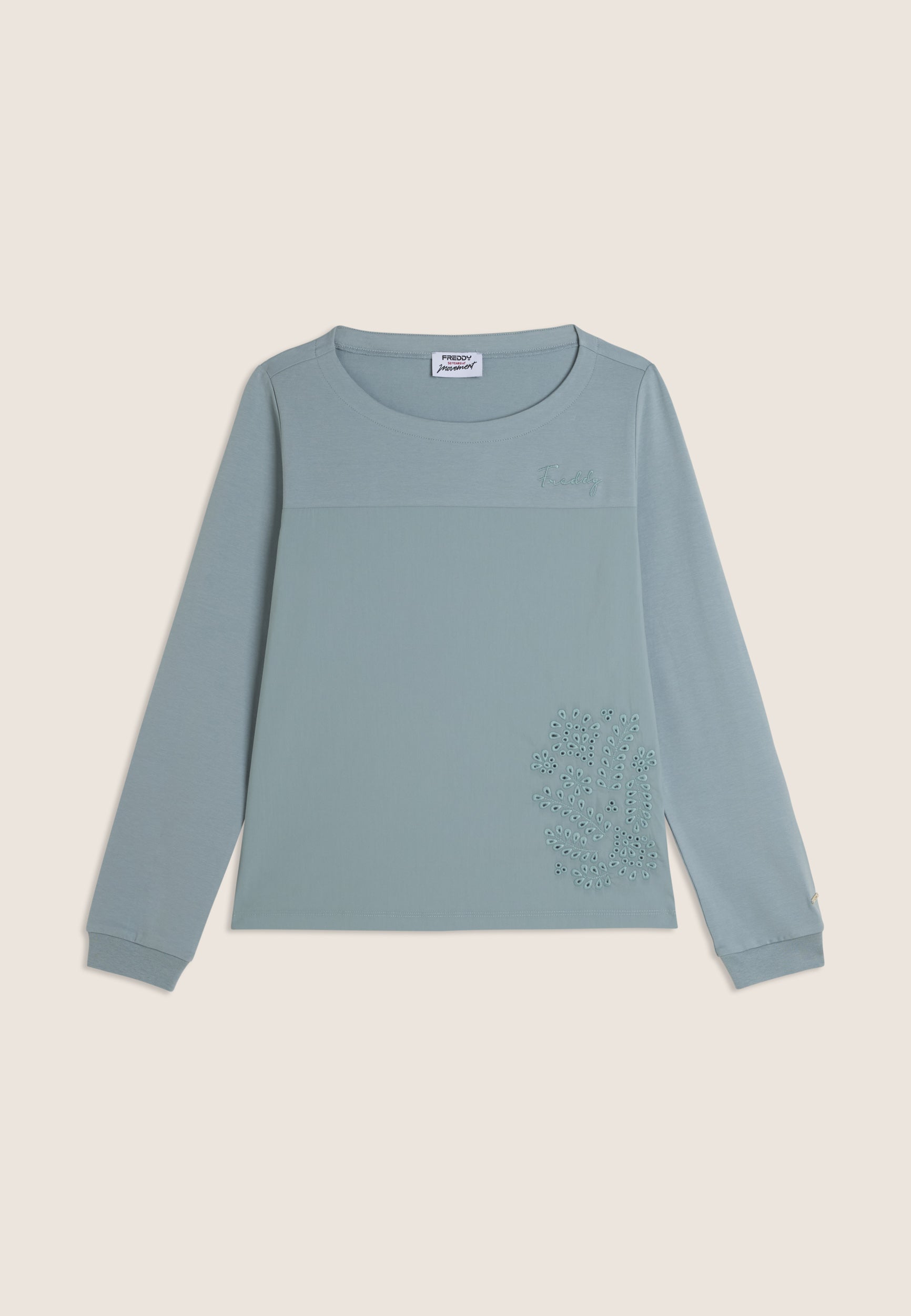 Regular-fit, standard-length sweatshirt with straight hem and boat neck. The long sleeves are finished with ribbed cuffs for a neat look. The front of the bust is in stretch poplin fabric, decorated with broderie anglaise-style floral embroidery on the side. A small embroidery logo on the heart and a golden FREDDY logo tab on the bottom left sleeve complete the elegant design. Made of heavy cotton stretch jersey, the sweatshirt is ideal for those seeking comfort and style.