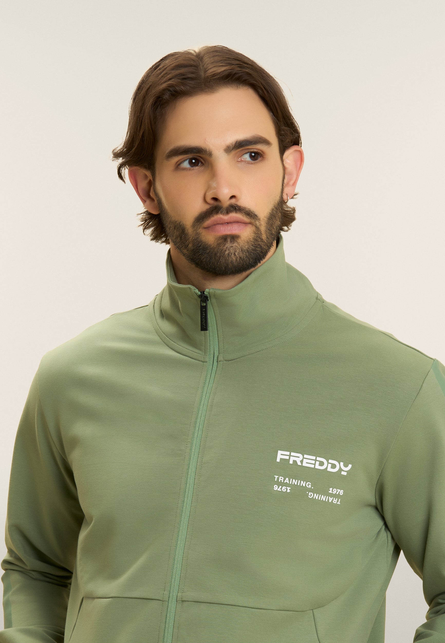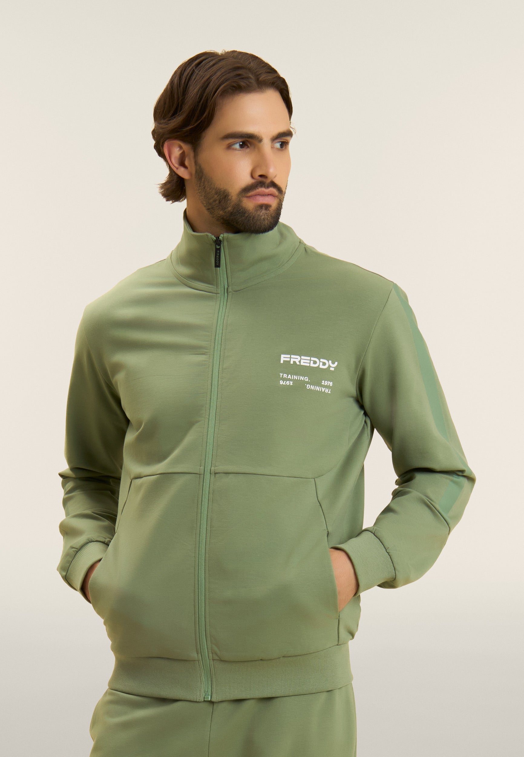 Men's full-zip sweatshirt with a regular fit and regular length. The sporty design is enhanced by a high neck, long sleeves with panel stitching and ribbed cuffs for a comfortable fit. The ribbed band at the bottom maintains the shape of the garment even with daily use. Tone-on-tone printed side bands along the sleeves and a rubberised effect logo printed on the heart complete the style with neat details. Front besom pockets add practicality. Made of Baby French Terry, a soft and stretchy cotton fabric with a smooth outer surface and slightly spongy interior, perfect for comfort during activity and leisure time.