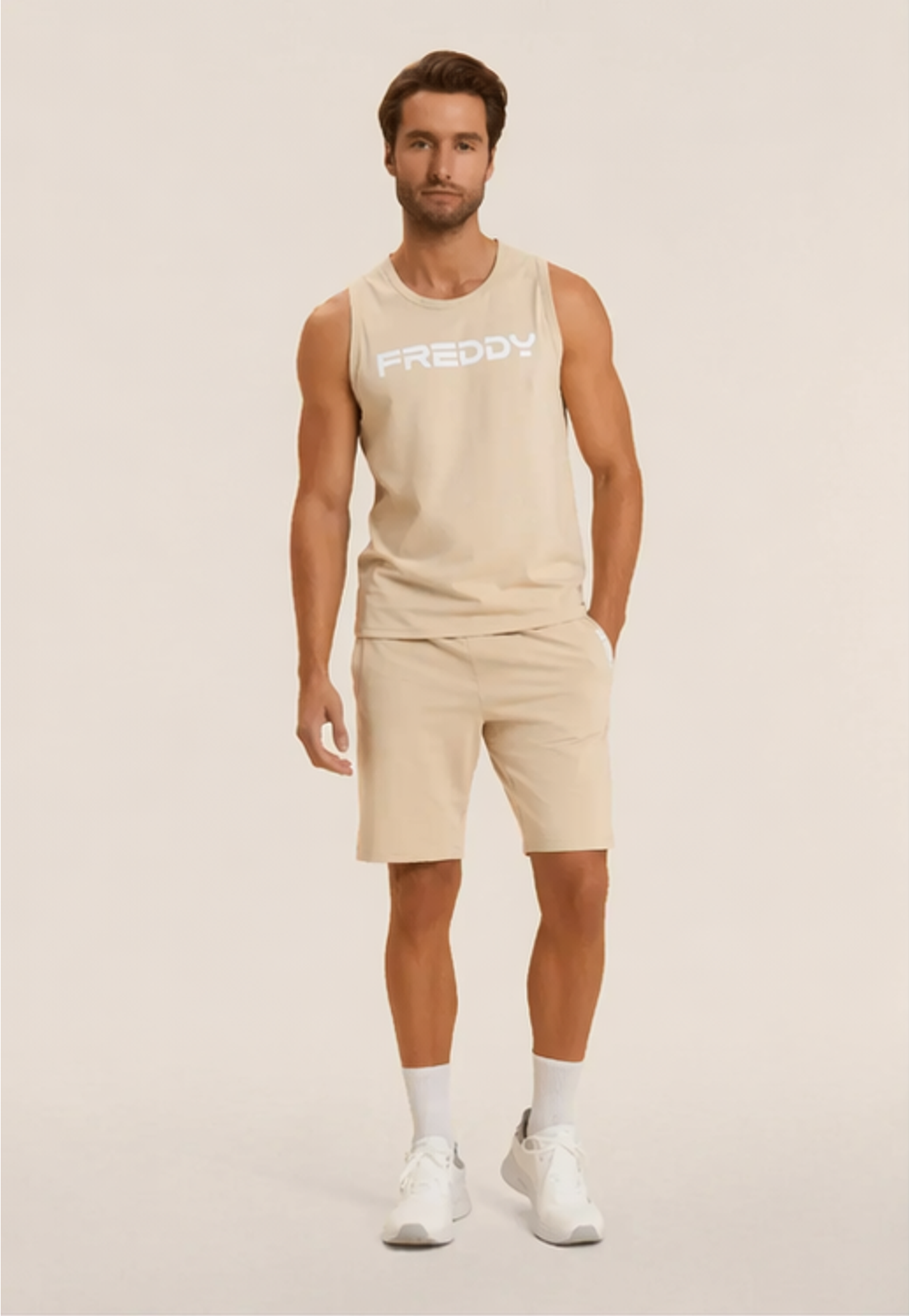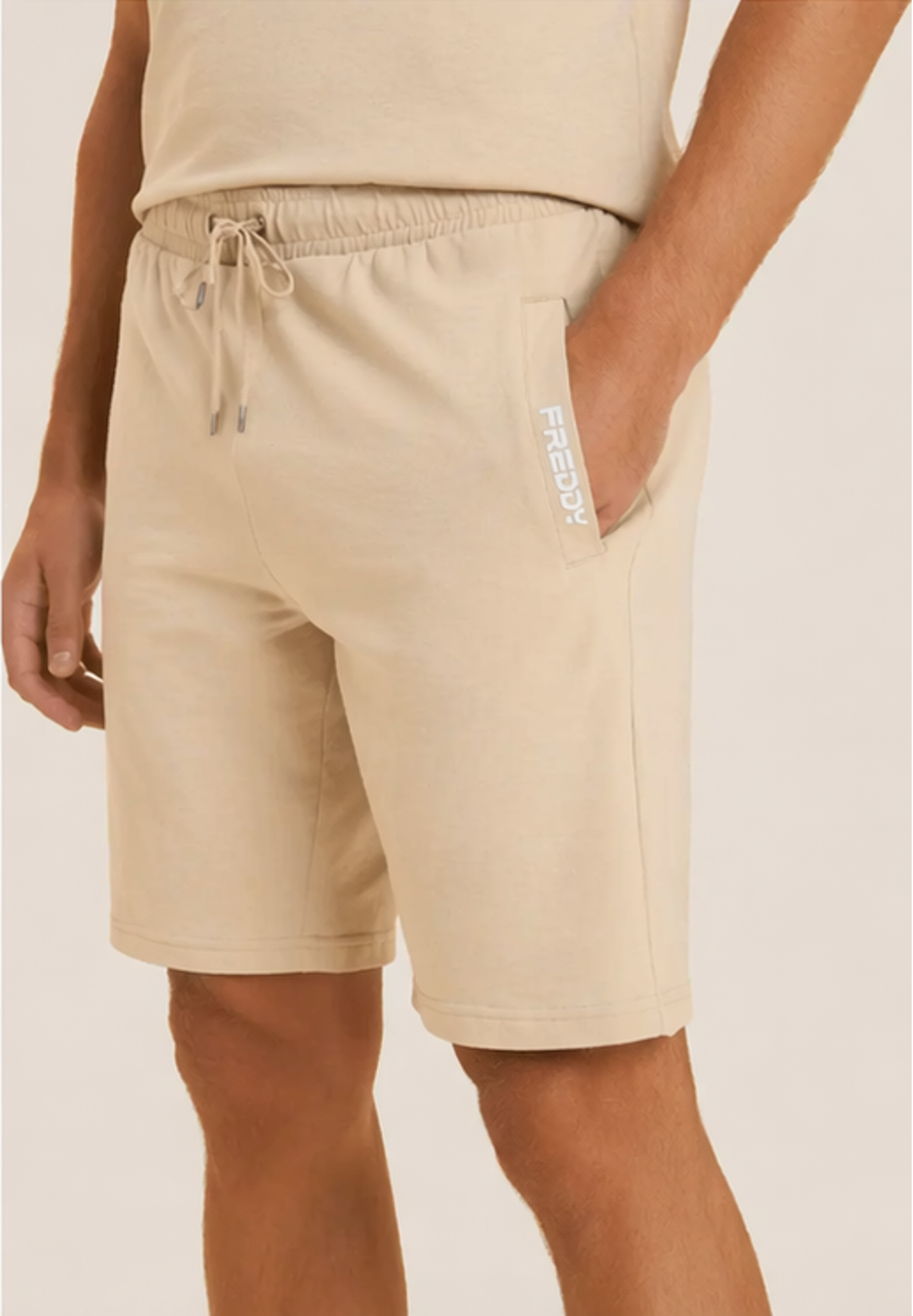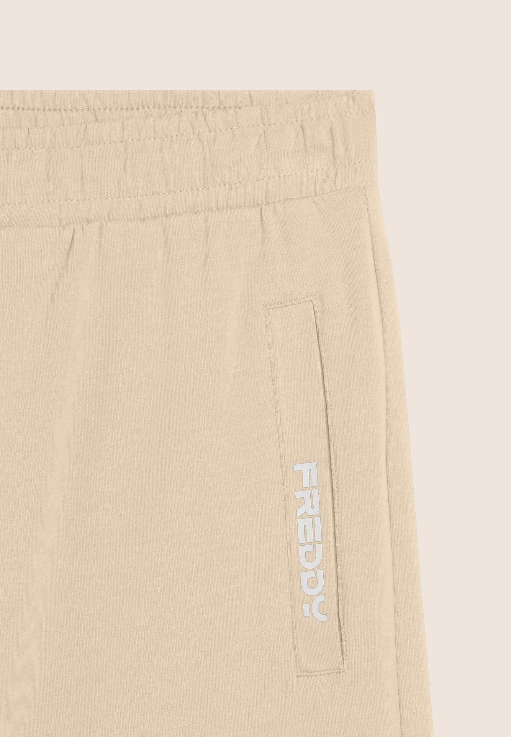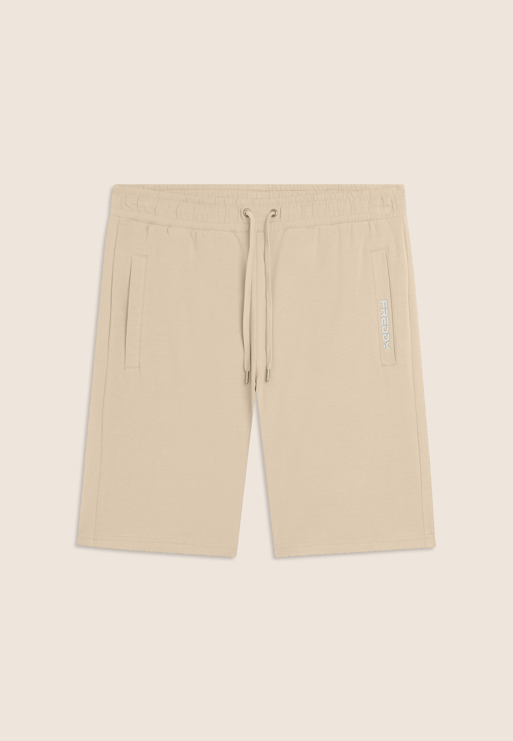 Shorts in heavy stretch jersey, regular fit and above-the-knee length. Waistband with inner elastic and drawstring, straight leg. Equipped with front besom pockets and right rear pocket. The matt rubberised FREDDY logo print is positioned on the opening of the left pocket. Ideal for leisure and warmer weather.