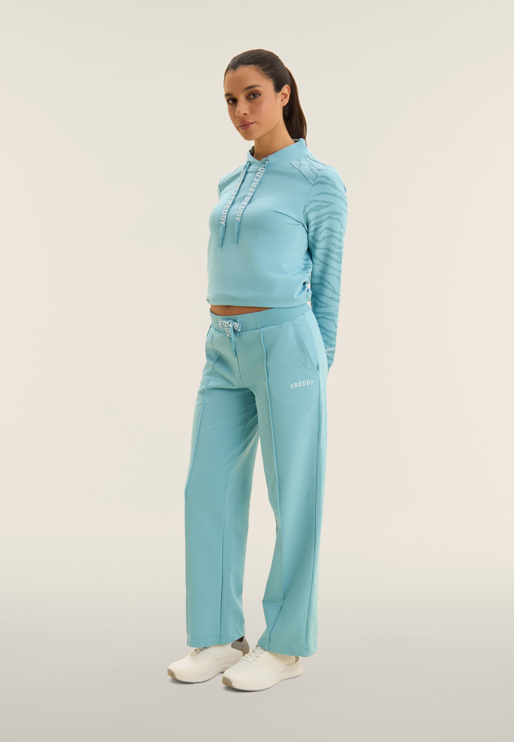 Wide-leg athletic trousers with straight bottom, regular waist and ribbed waistband with FREDDY logo drawstring. The loose, flowing cut enhances the figure without sacrificing comfort. The FREDDY logo in white glitter on the left side lends light and femininity. In stretch French terry, perfect for a relaxed, contemporary style.