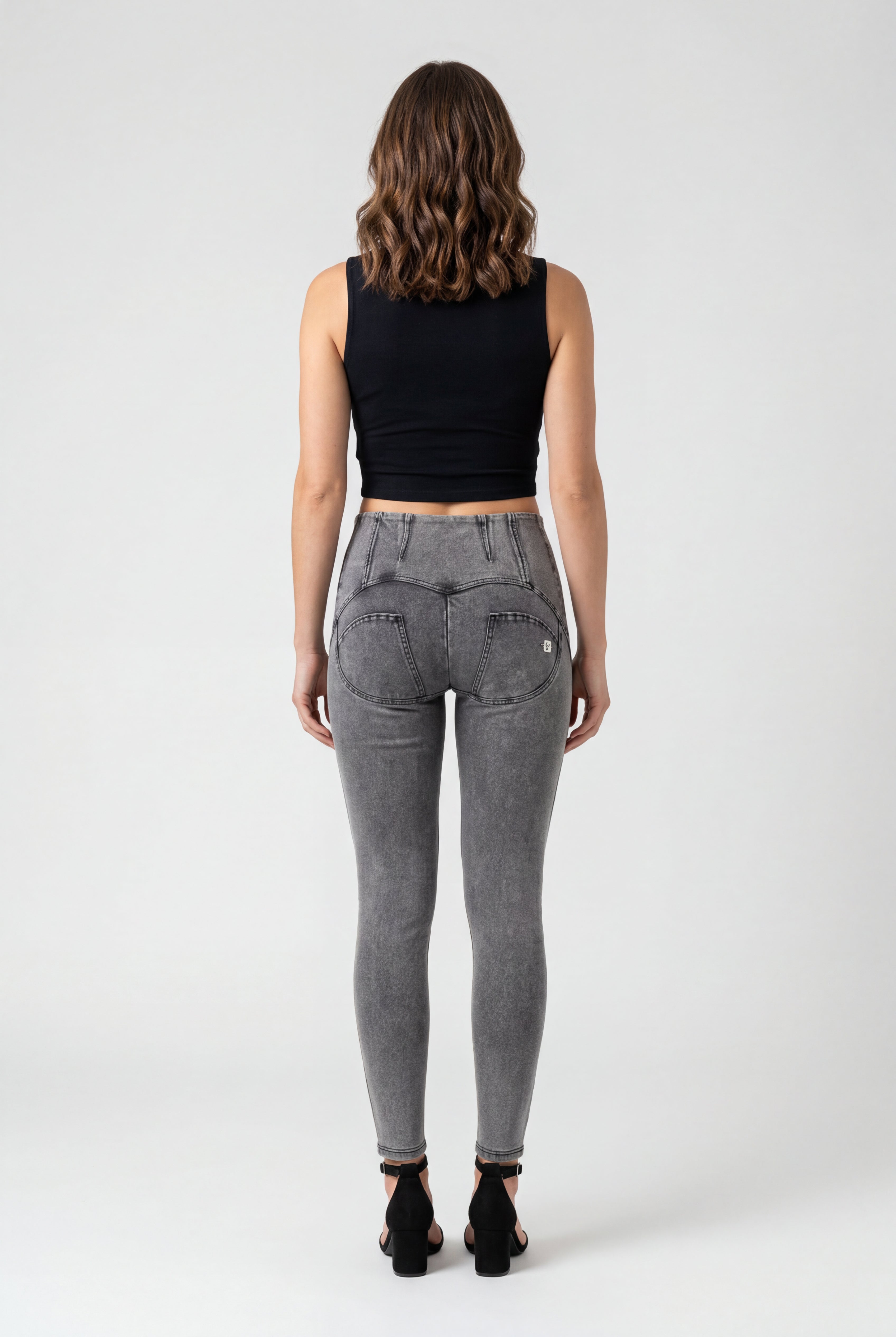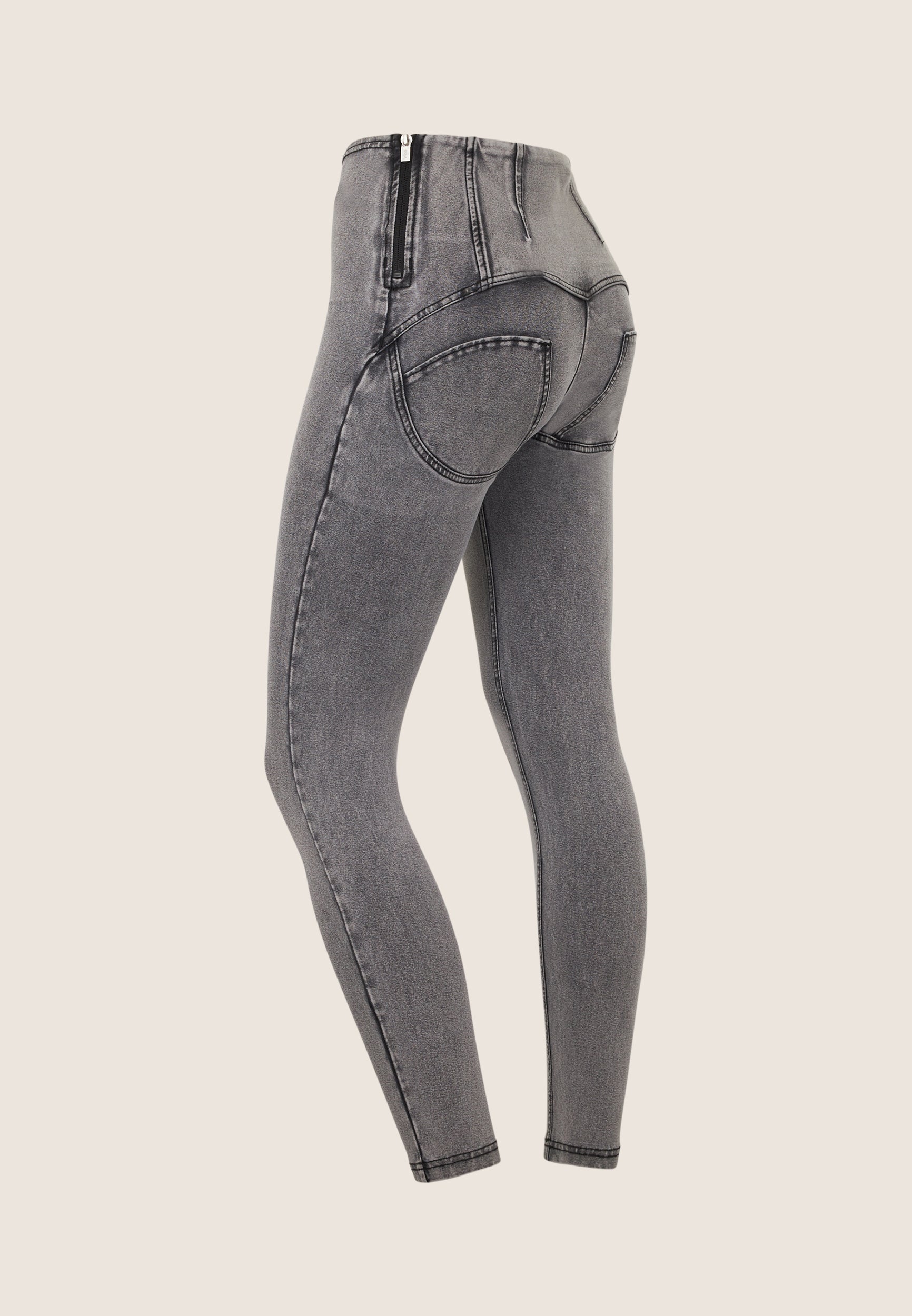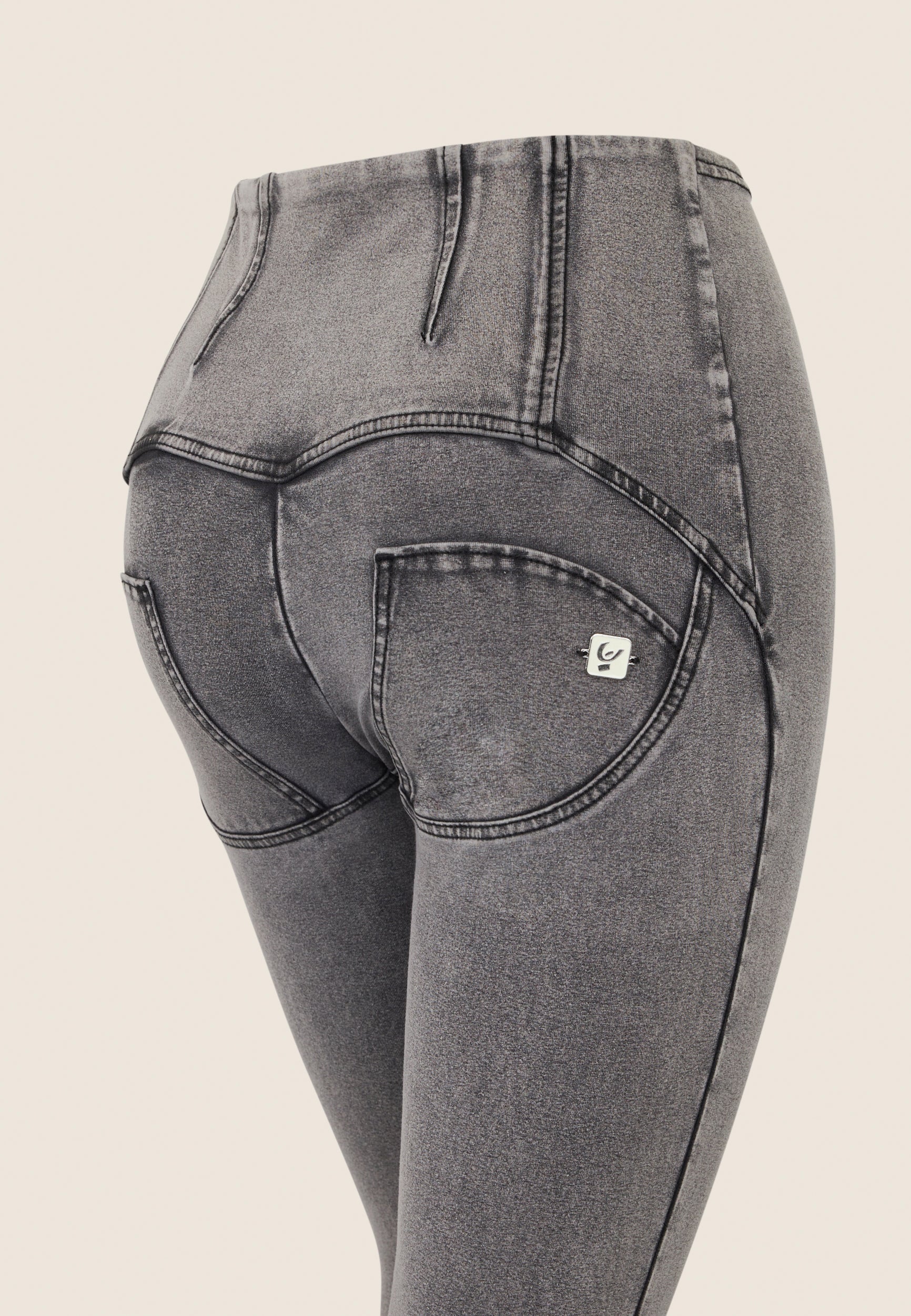 WR.UP Push-Up High Waist Skinny 7/8 Denim Jeans With Stud Ring Waist Band - Denim Gray - Black Seam