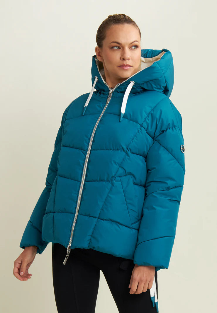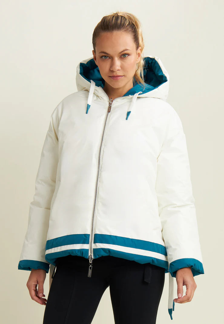Reversible down jacket with comfort fit and hip length, ideal for creating different looks. Quilted with horizontal bands on one side and contrasting details on the other, it has animal-friendly fake-down padding to retain the heat, remaining lightweight even in wet weather. Full-zip fastening, adjustable drawstring hood and drawstring waist to adjust the fit. Front pockets with hidden snap fastening and rhinestone logo complete the versatile design.
