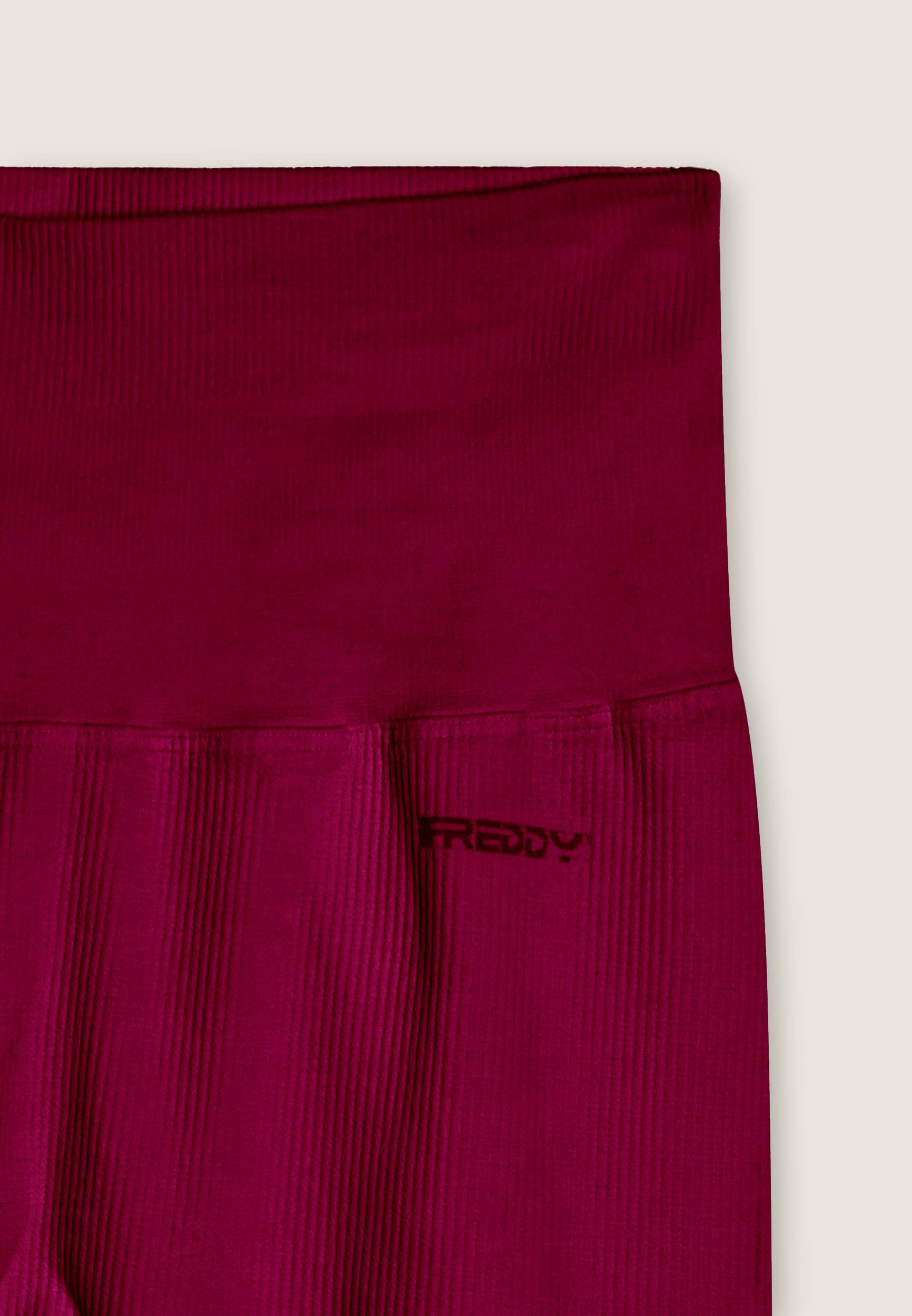 Sports leggings with 7/8 length and skinny leg, made from seamless ribbed fabric for absolute comfort. The very high waist guarantees a stable hold during training, while the heart-shaped seams on the buttocks naturally enhance the shape. Finished with a FREDDY logo on the front and “small man” logo on the back.