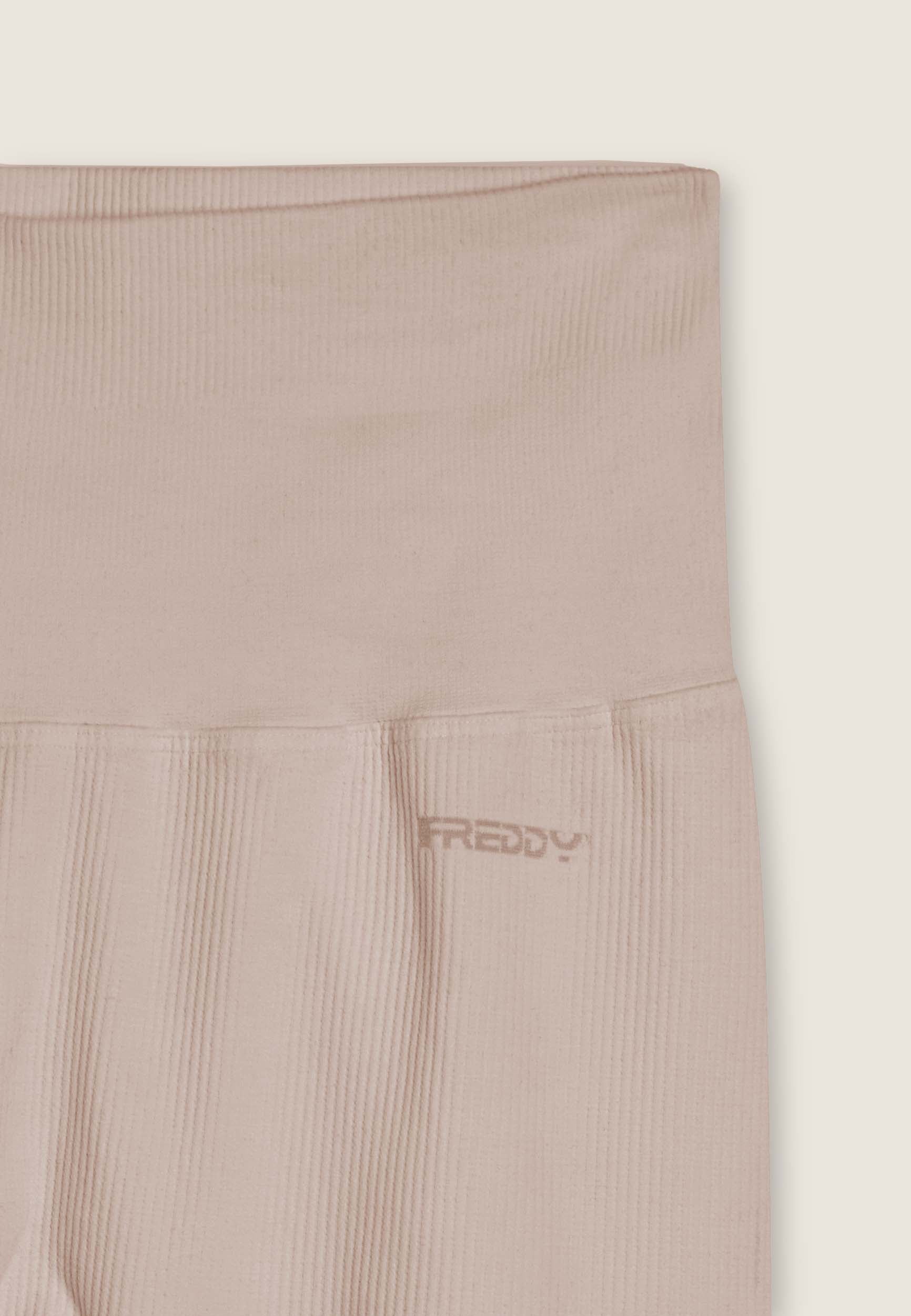 Sports leggings with 7/8 length and skinny leg, made from seamless ribbed fabric for absolute comfort. The very high waist guarantees a stable hold during training, while the heart-shaped seams on the buttocks naturally enhance the shape. Finished with a FREDDY logo on the front and “small man” logo on the back.