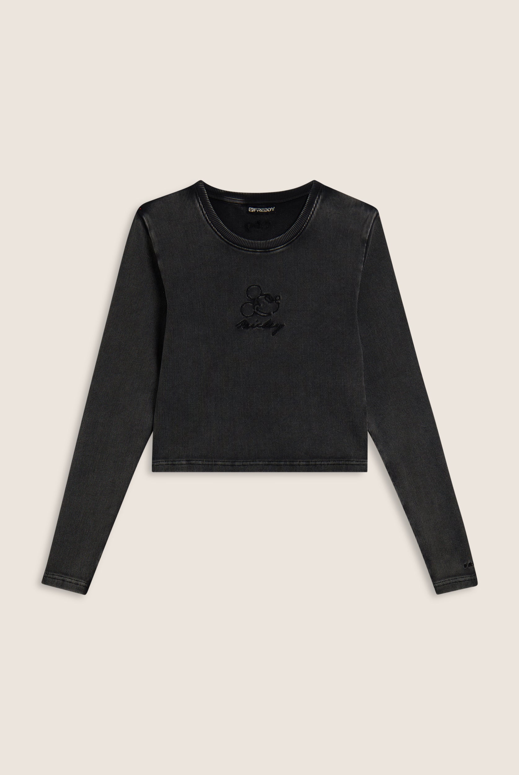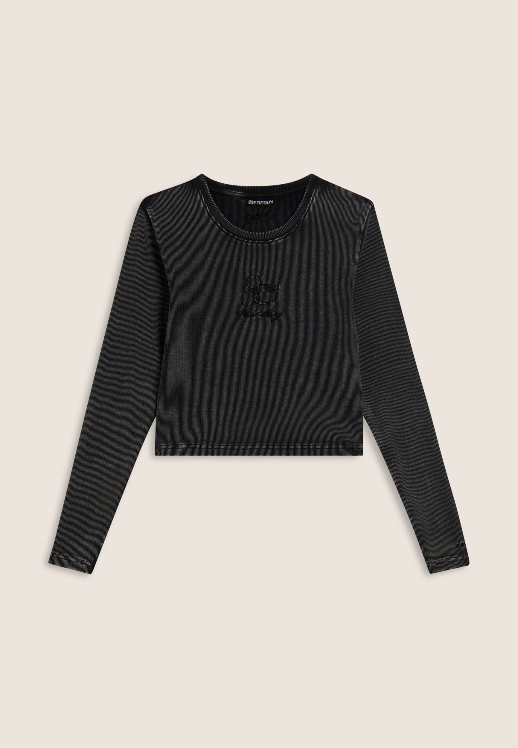 Long-sleeved T-shirt with cropped cut and slim fit, made from ribbed cotton with acid wash effect treatment for a natural, worn and faded look. The front is embellished with tone-on-tone Mickey Mouse embroidery, accompanied by a small Disney logo and the FREDDY logo on the sleeve bottom, both embroidered.