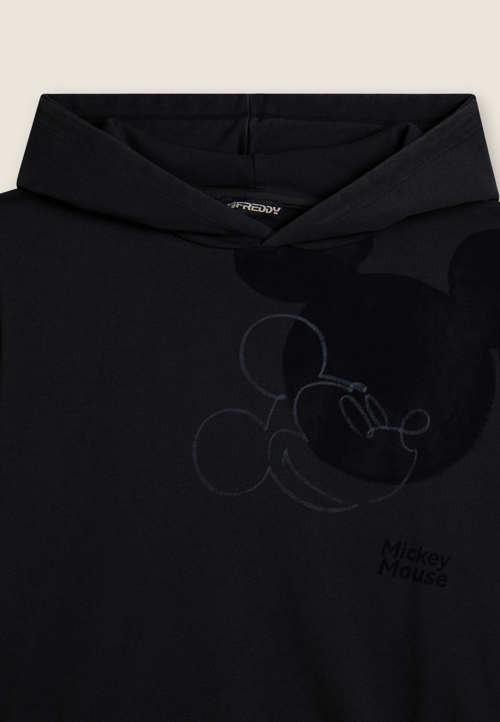 Women's comfort fit French terry sweatshirt. The jersey-lined hood is combined with dropped-shoulder sleeves and ribbed cuffs. The bottom is finished with a ribbed waistband. The large Mickey Mouse print on the front is accompanied by the small Disney logo on the back and the FREDDY logo decorated with rhinestones on the sleeve bottom. The acid wash effect gives the garment a worn look and irregular shades, making it unique.