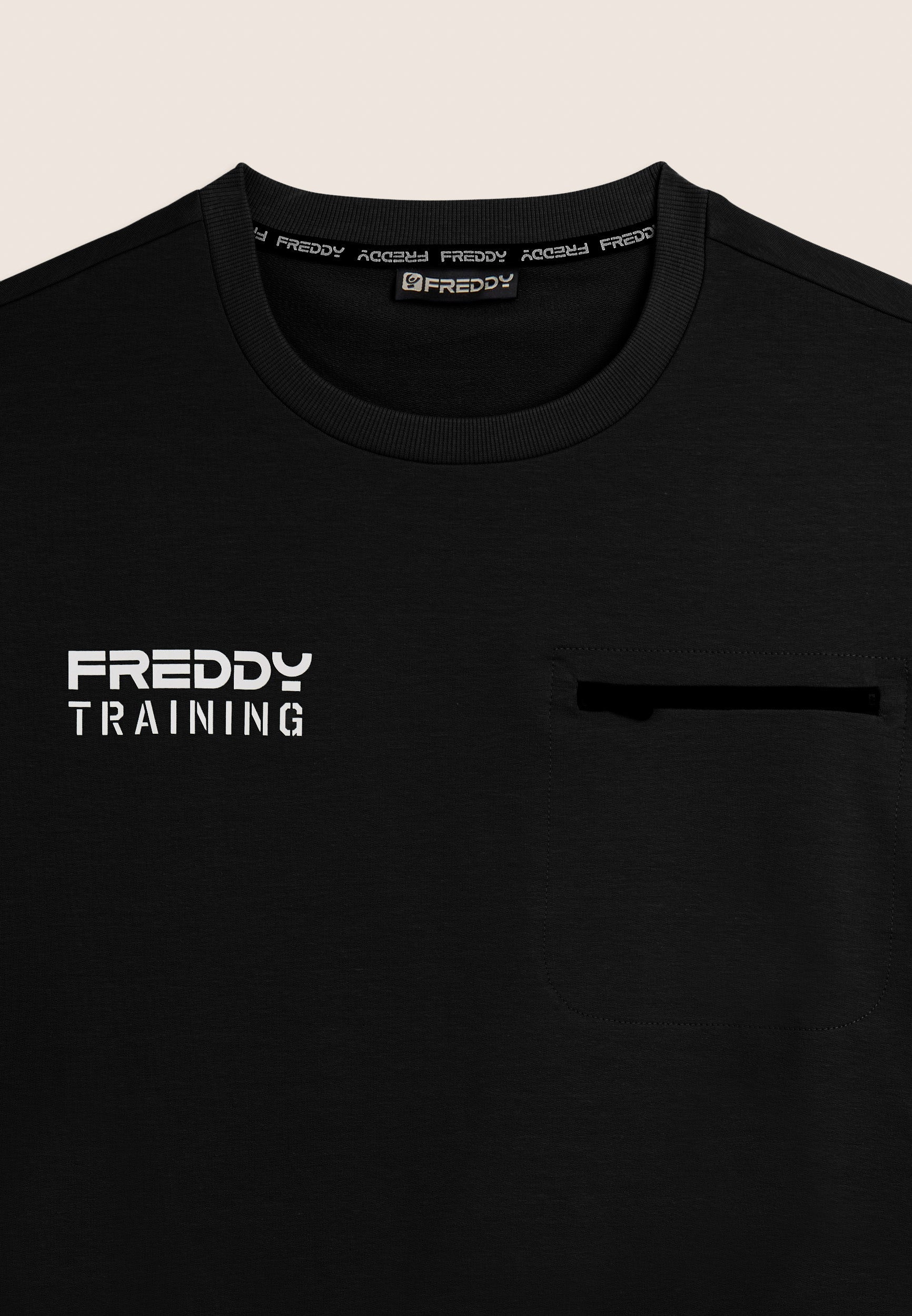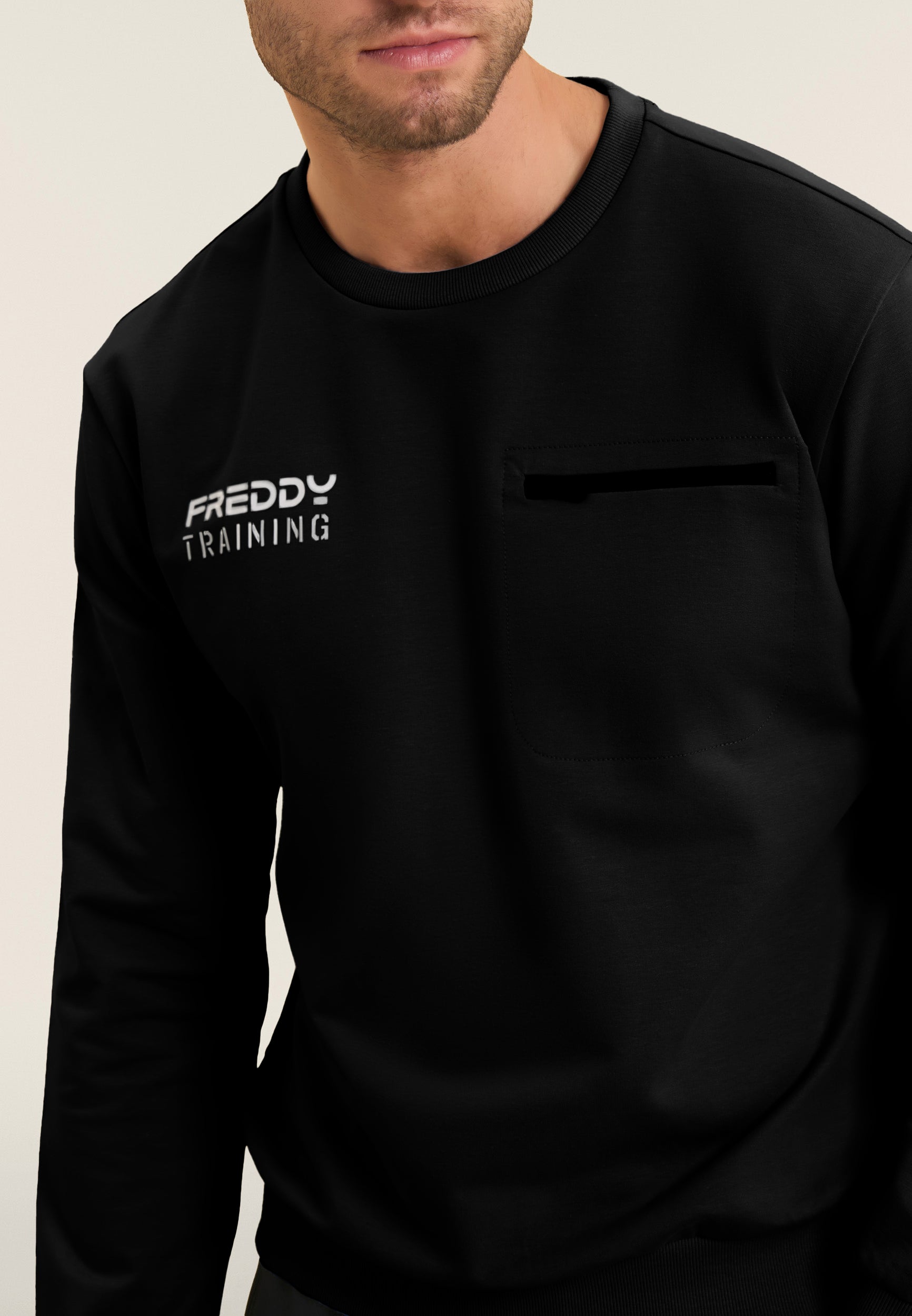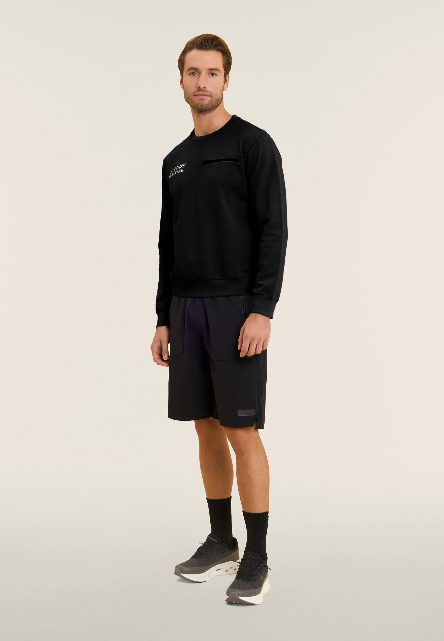 Men's sweatshirt with crew neck, regular fit and regular length, perfect for everyday use and light training. The structure includes a hem band and ribbed cuffs for a comfortable fit. The applied heart-side zipped pocket is enriched by the rubberised logo print, which gives it a modern and distinctive touch. The garment is made of Baby French Terry, a stretch fabric that guarantees softness and freedom of movement.