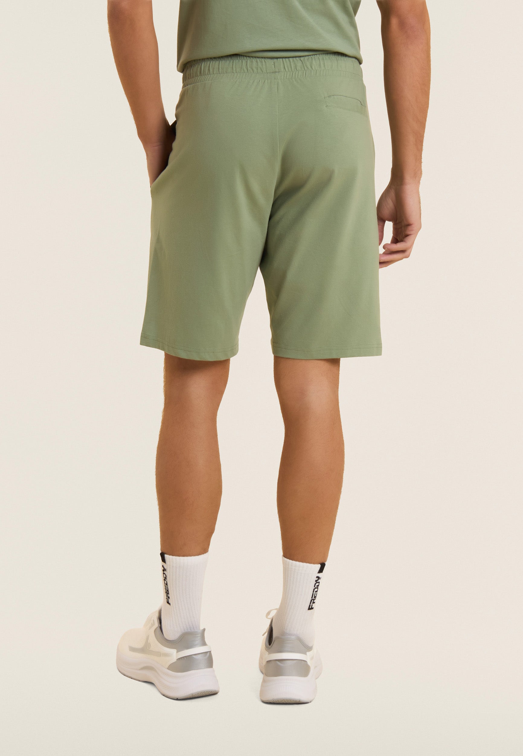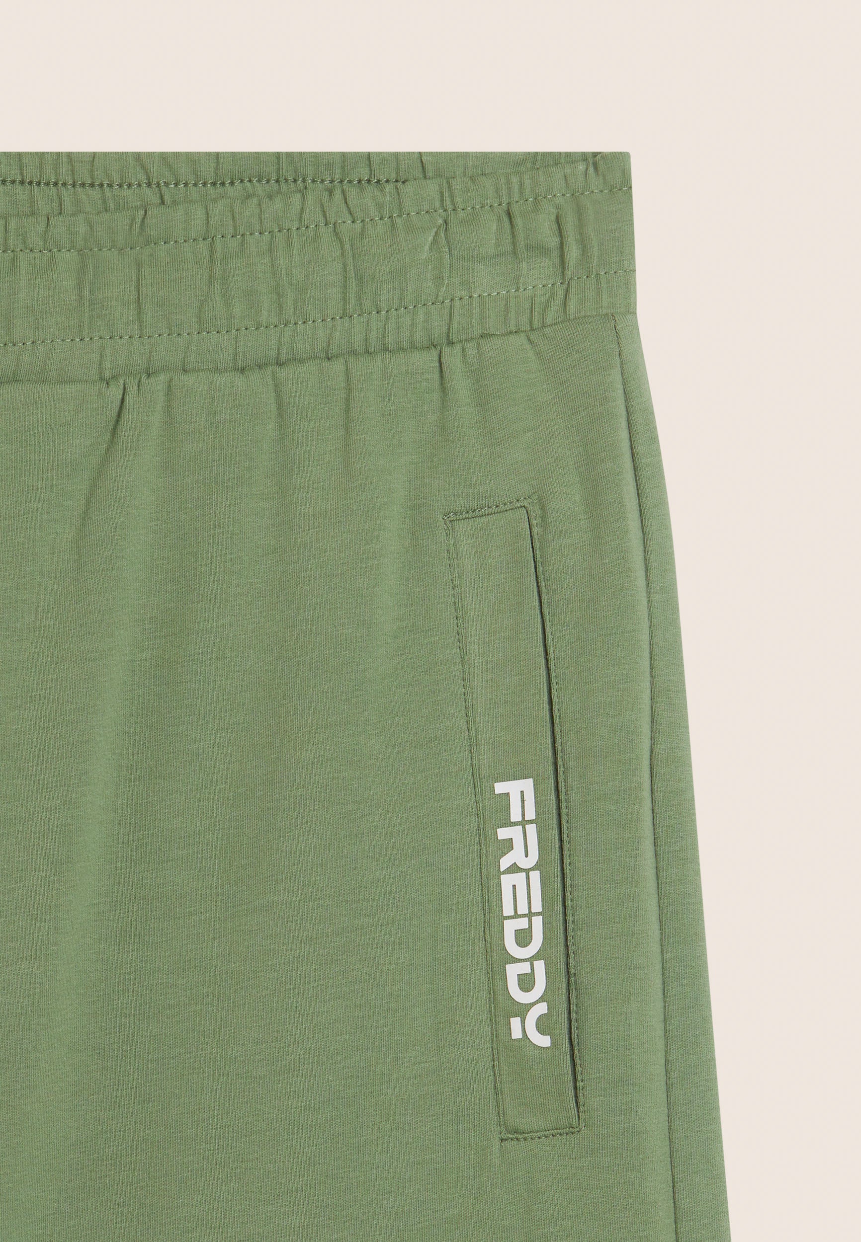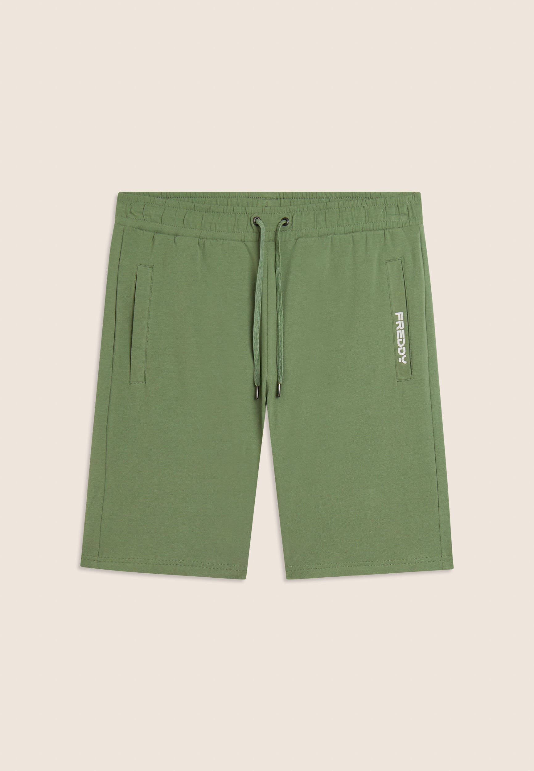 Shorts in heavy stretch jersey, regular fit and above-the-knee length. Waistband with inner elastic and drawstring, straight leg. Equipped with front besom pockets and right rear pocket. The matt rubberised FREDDY logo print is positioned on the opening of the left pocket. Ideal for leisure and warmer weather.