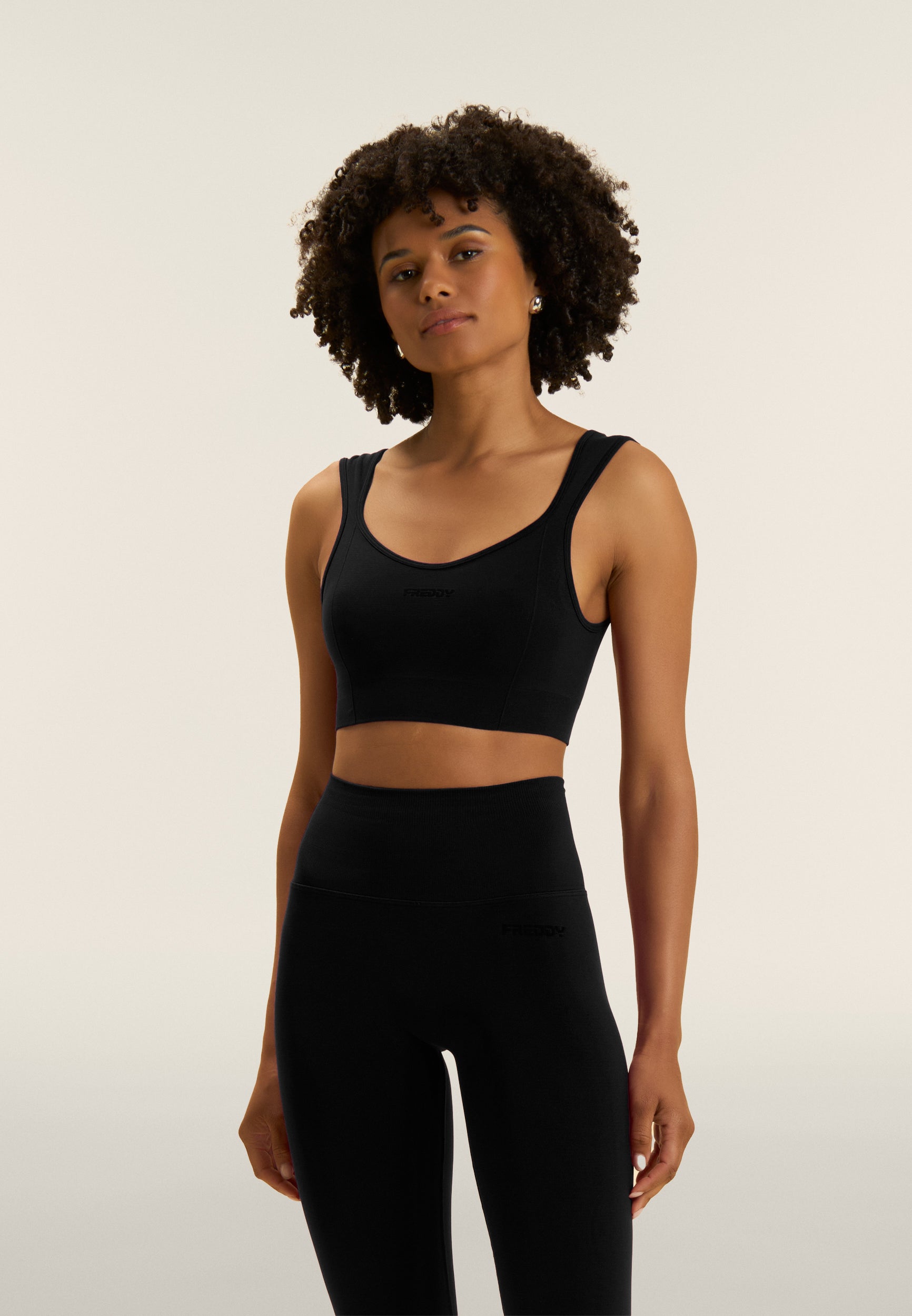 With its feminine and comfortable design, this light support sports top is perfect for yoga and low intensity activities. Sweetheart neckline at the front and square neckline at the back with regular shoulder straps. The nylon jersey performance fabric is soft, breathable and lightweight, with a small FREDDY contrasting logo on the front.