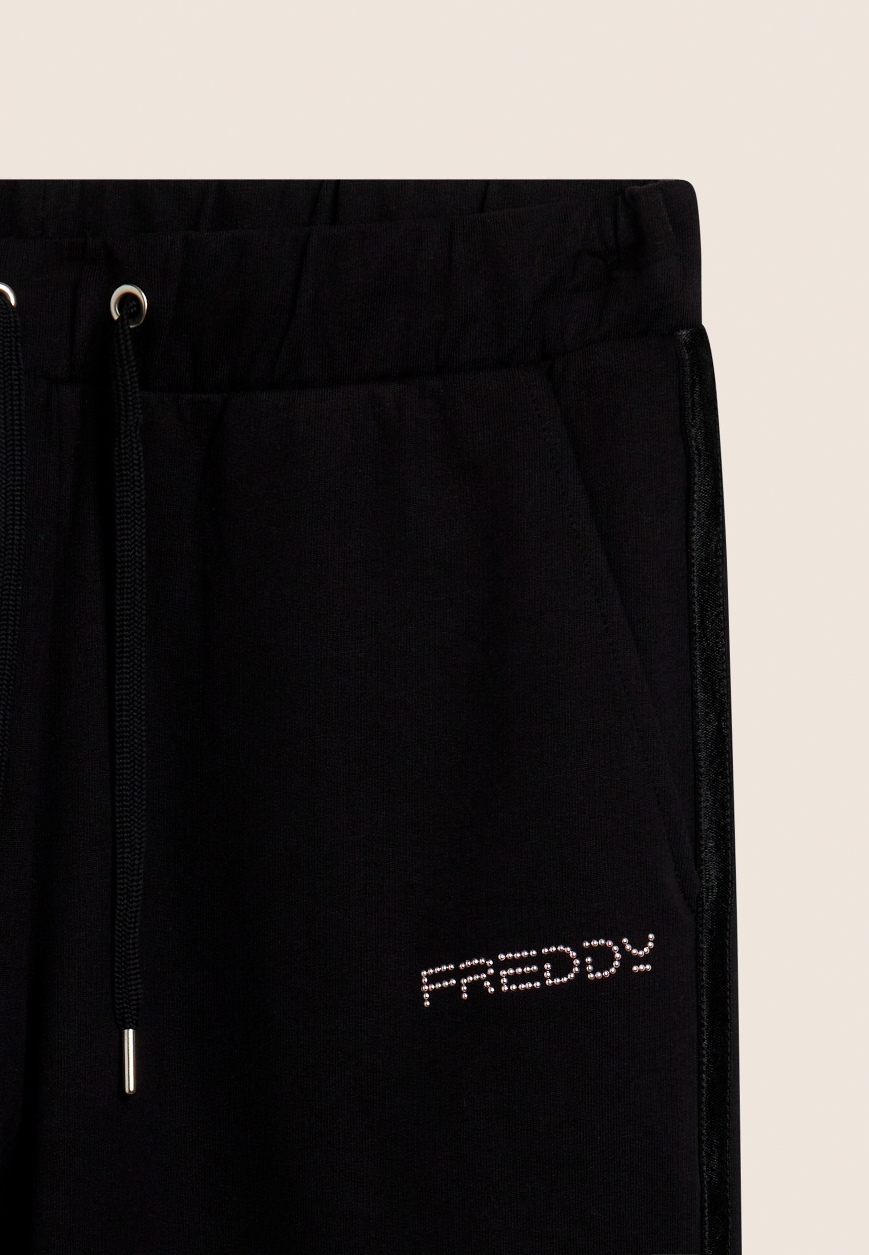 Athletic trousers with comfort fit, wide leg and cropped length, ideal for light activities and relaxing moments. The waist has internal elastic and is adjustable through the drawstring. The FREDDY logo in light pink beads on the heart and the shiny elastic inserts decorating the side seams add a touch of style. Made of heavy cotton stretch jersey, they offer maximum comfort.