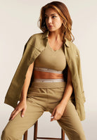Biustonosz sportowy w kolorze szarym z najnowszej kolekcji. Wykonany z sportowymi detalami, idealny dla aktywnego stylu życia lub looku athleisure. Doskonały do uzupełnienia Twojej garderoby.