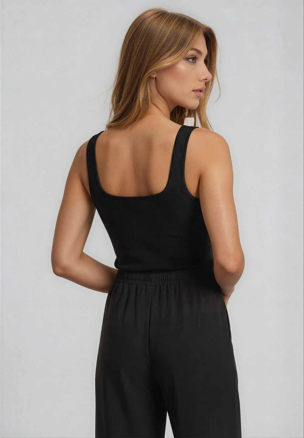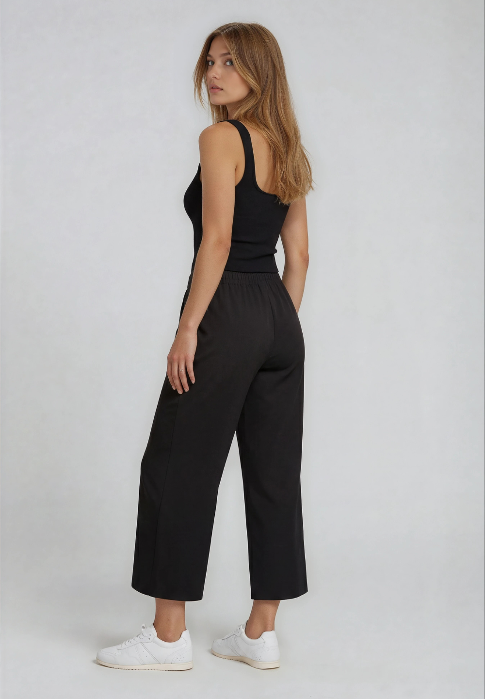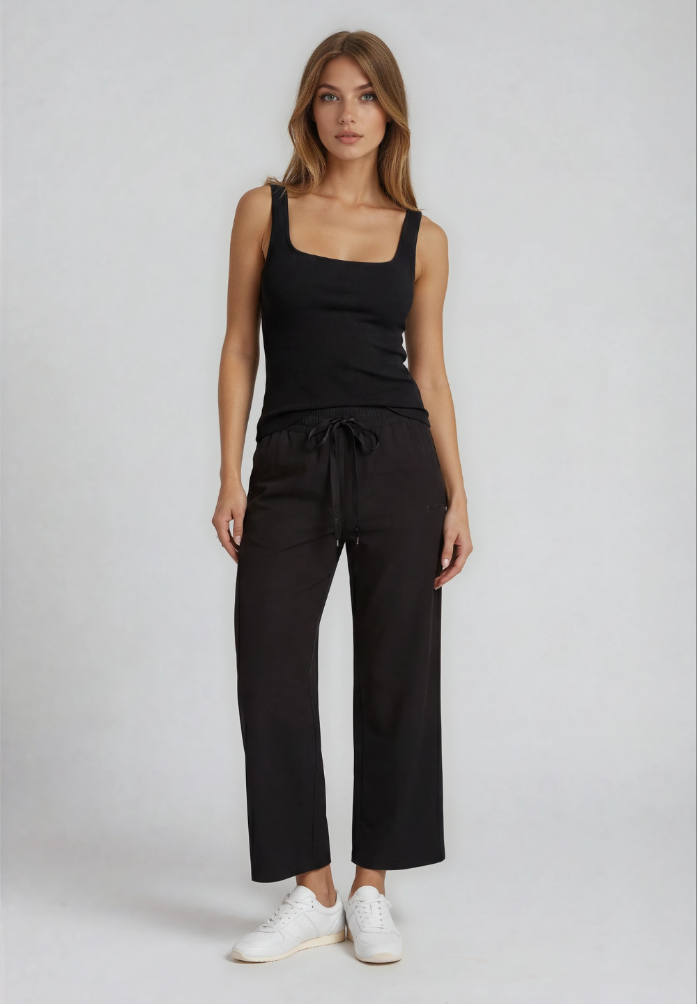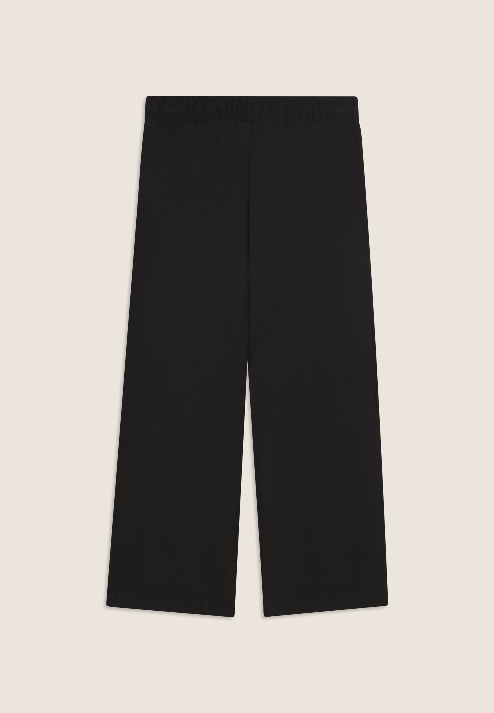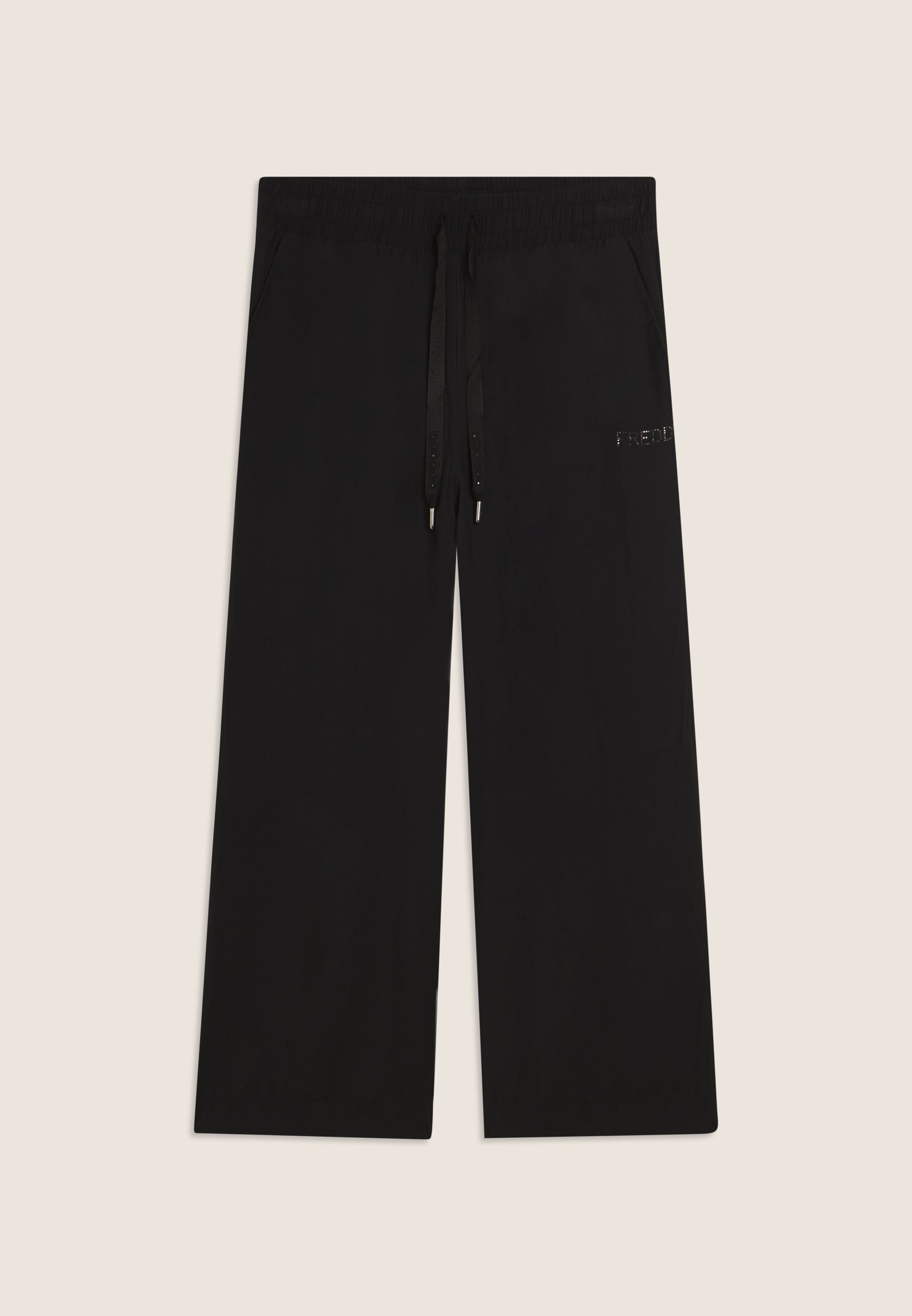 Athletic trousers with comfort fit and cropped length, featuring a regular waist with inner elastic and drawstring. The wide leg gives a relaxed and modern look. The FREDDY logo, made of matching rhinestones, is located on the left side, adding a touch of brightness. Slant pockets complete the functional design. The fabric, with a silky glossy finish, combines the softness of modal with a light and breathable structure, perfect for elegant and fresh garments.