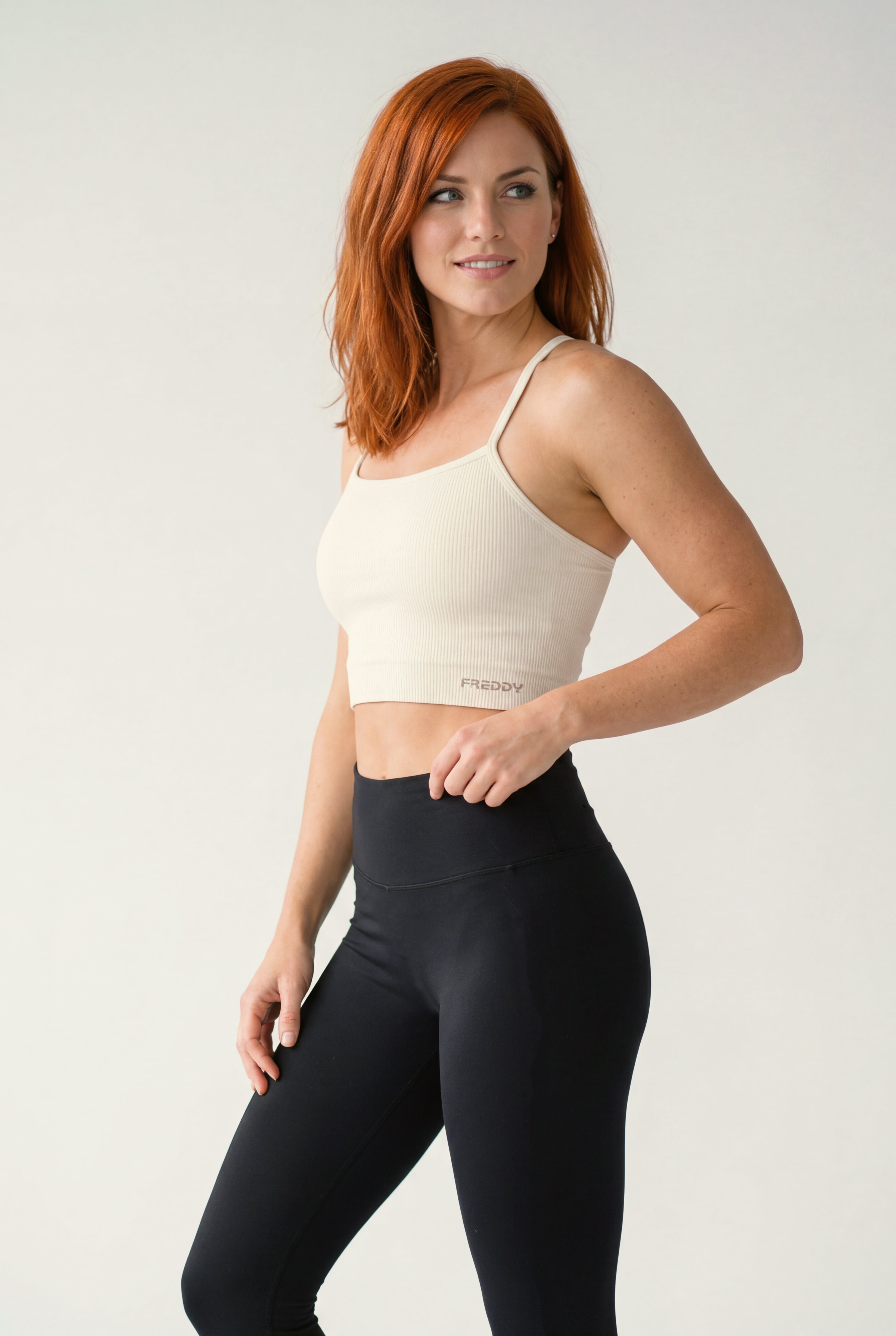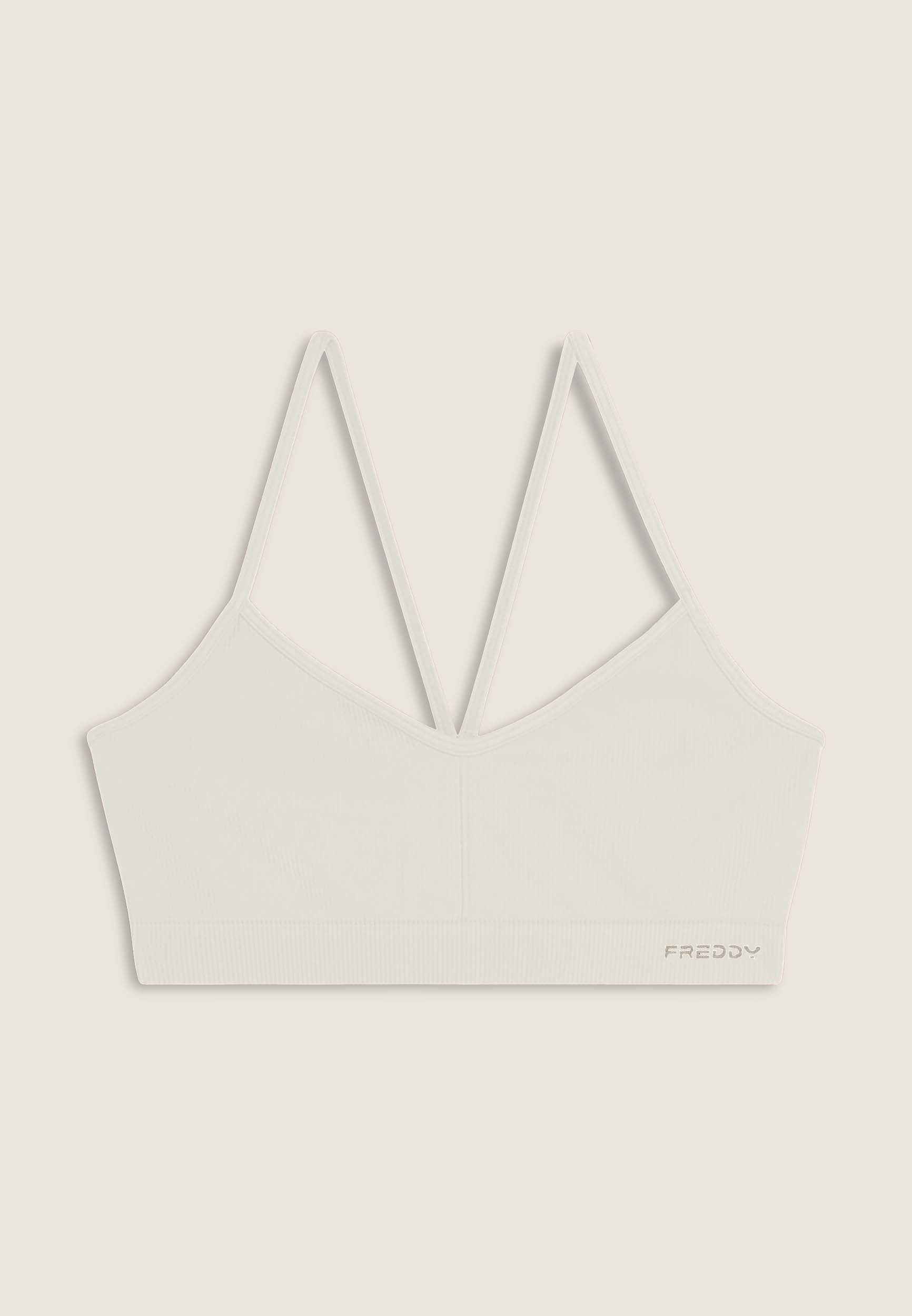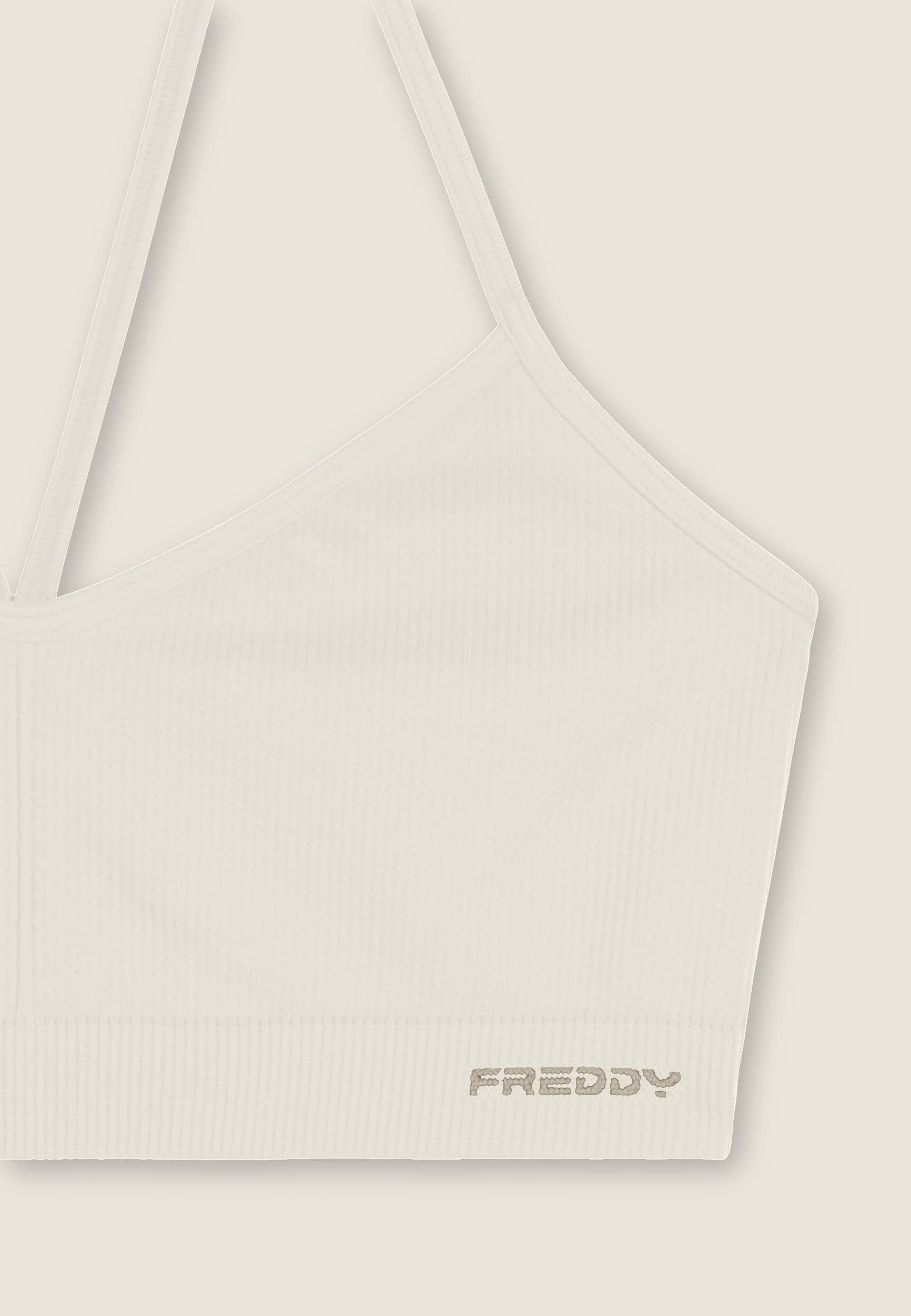 Sport-BH mit mittlerem Stütz, ideal für Trainingseinheiten mit unterschiedlicher Intensität. Er besteht aus nahtlosem, geripptem Material, passt sich perfekt den Körperkonturen an und bietet höchsten Tragekomfort. Das Design umfasst einen weiten Ausschnitt und dünne, am Rücken gekreuzte Träger sowie ein kleines FREDDY-Jacquard-Logo auf dem Unterbrustband.